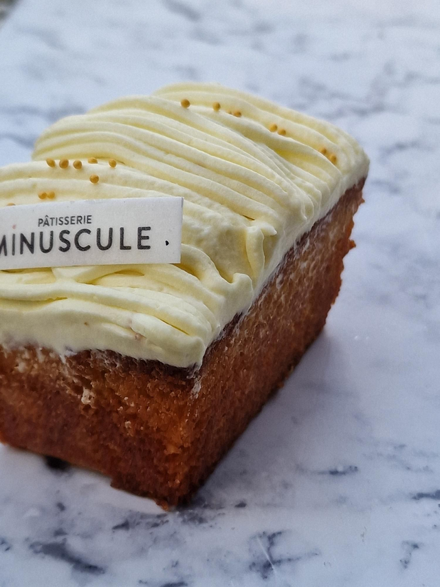 Cake fondant vanille (sans insert) et ganache légère aux notes de chocolat blanc.